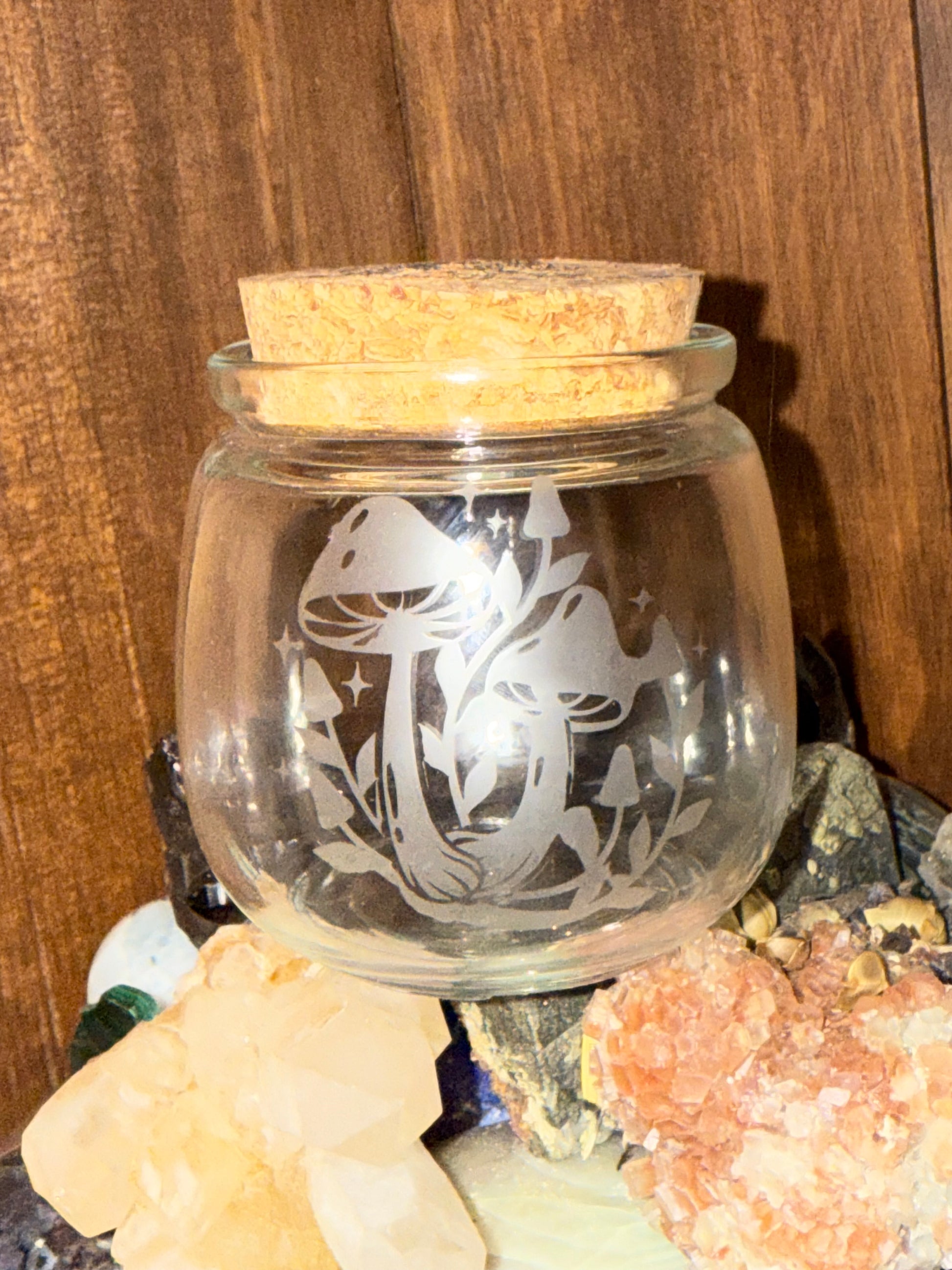 Beautiful glass etched jar great for catching moon water, propagating your clippings, or just a safe little spot for your magical trinkets.