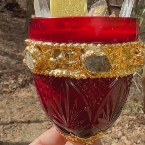 A vessel of pure enchantment, the “Golden Sun Chalice Candle” is a radiant fusion of fire, metal, and mysticism. Hand-poured with 100% soy wax, this candle is housed in a stunning red glass chalice, adorned with a Tiffany-style solder technique, giving it a golden-hued, antique metal finish with encrusted stones that glimmer in the light.