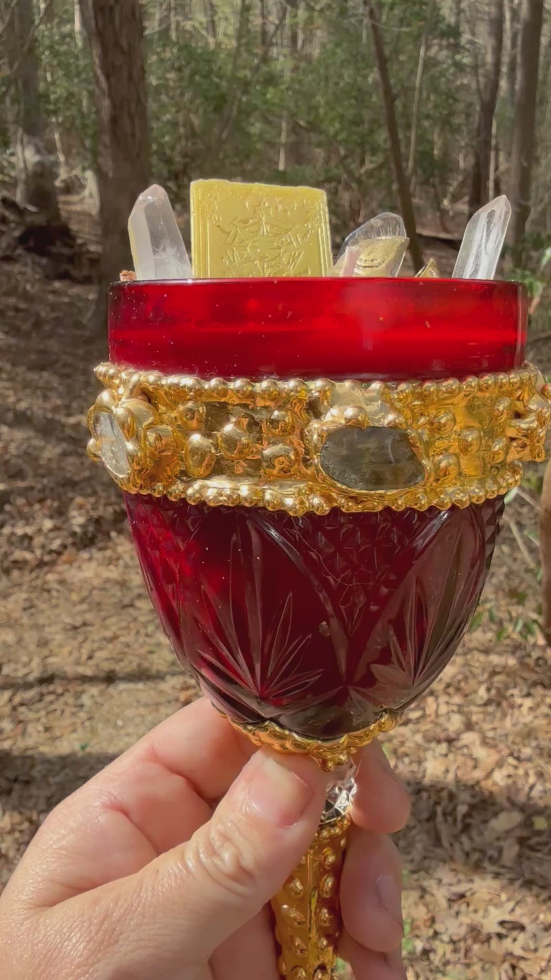 ✨ Red glass chalice with golden-hued solder & encrusted stones (a magical keepsake)