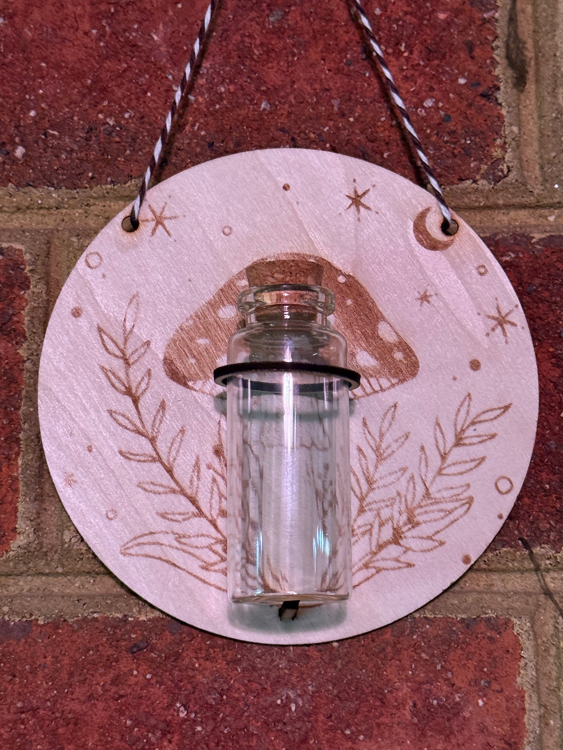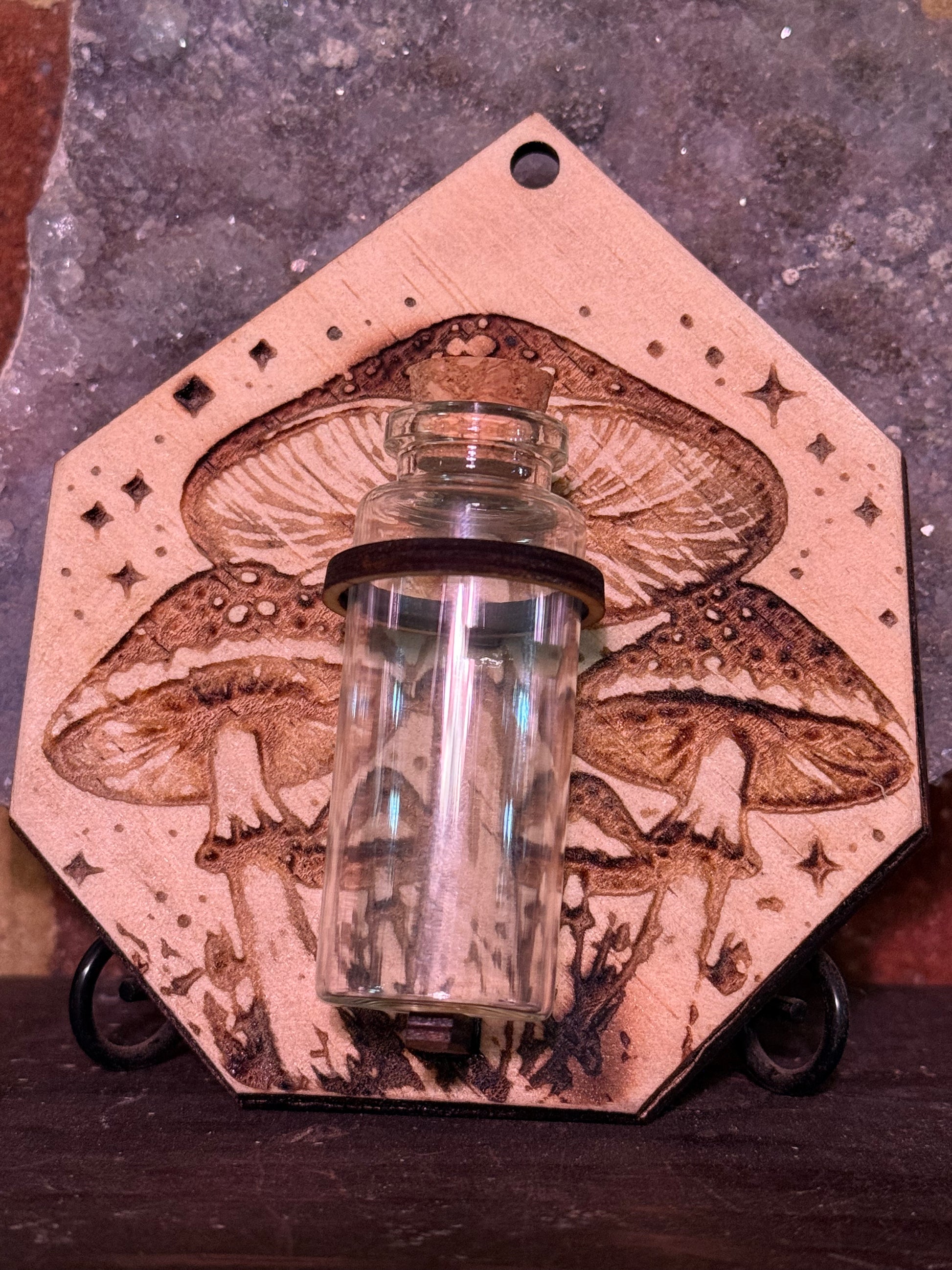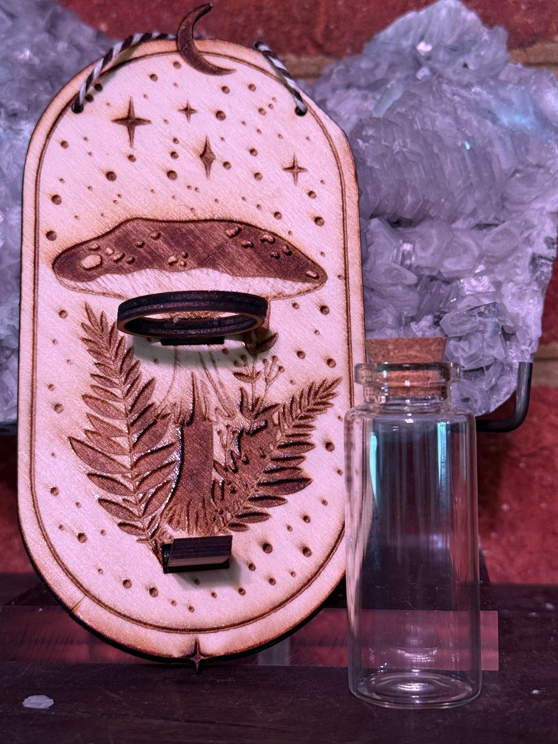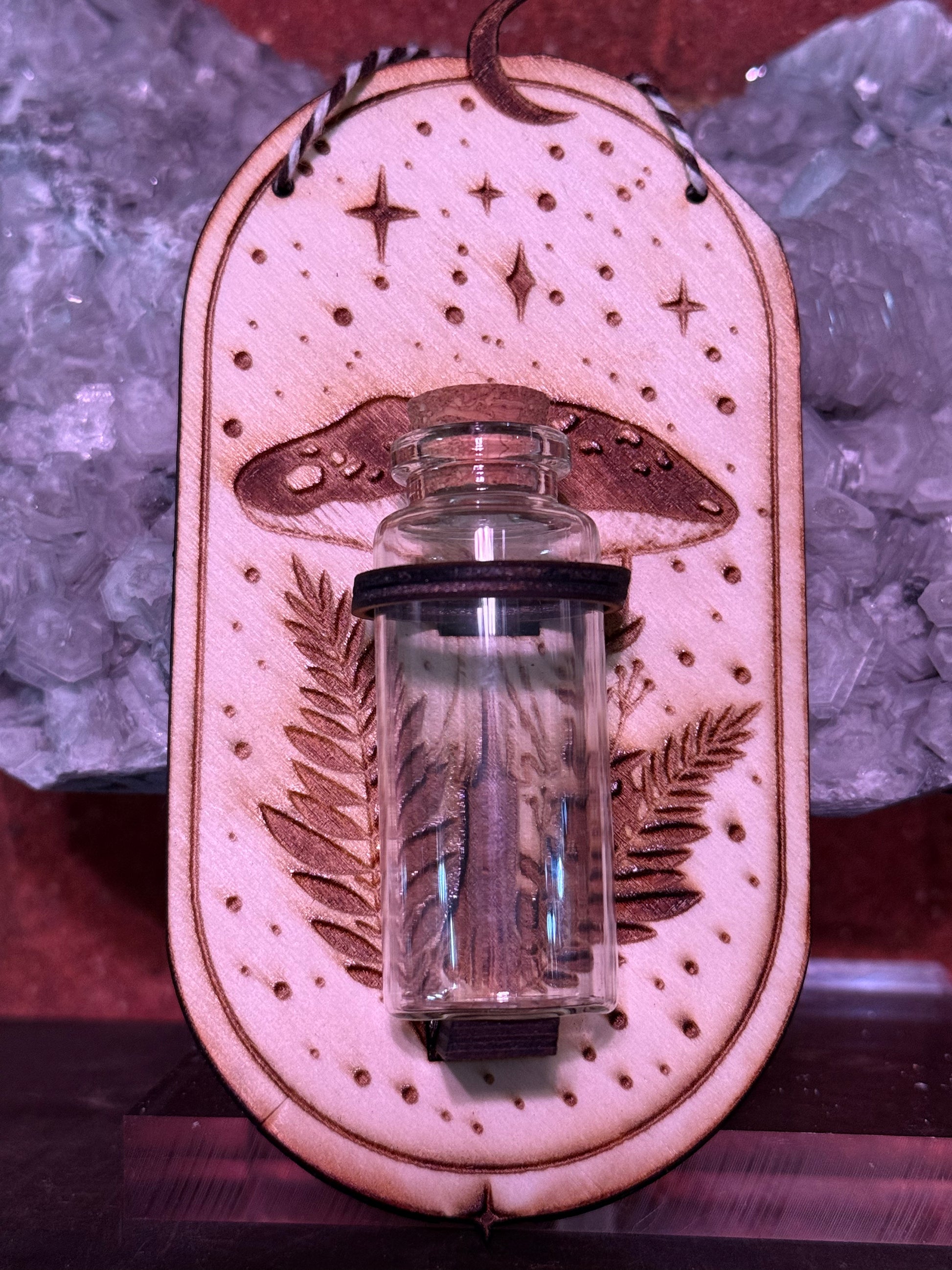 Each one is laser-engraved with woodland and celestial imagery, then paired with a delicate glass vial—creating a small but powerful space for growth, intention, and quiet magic.