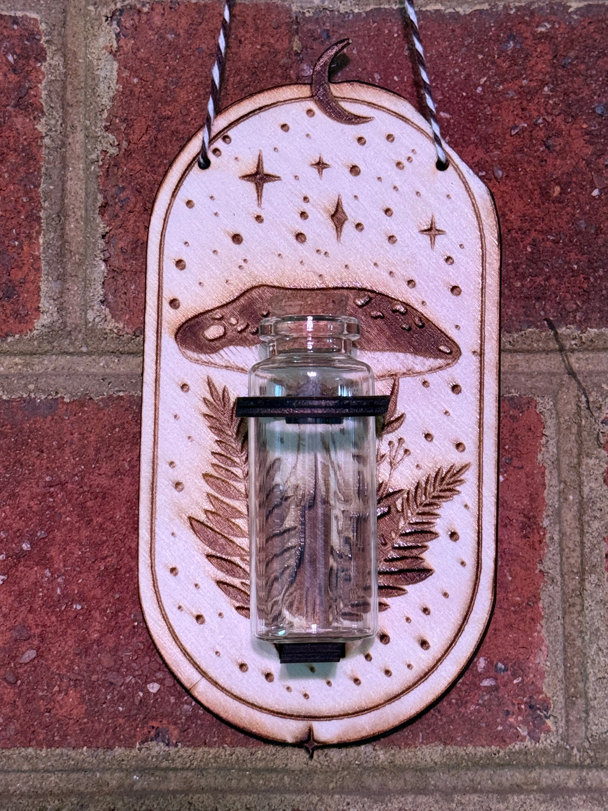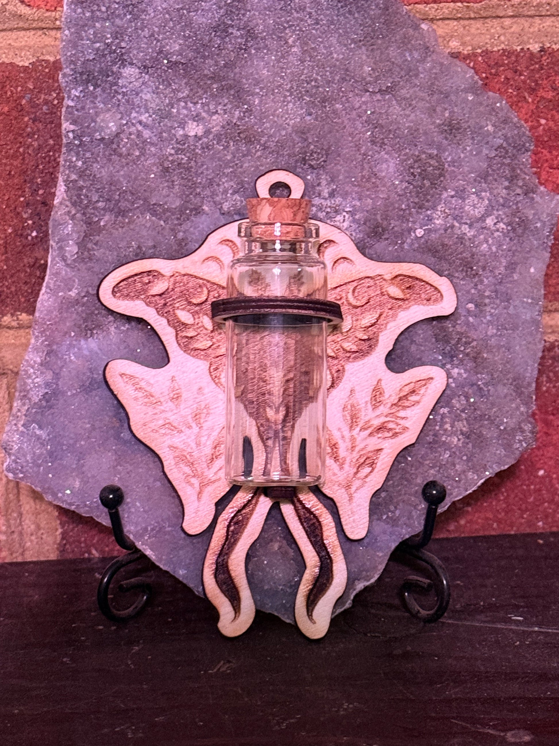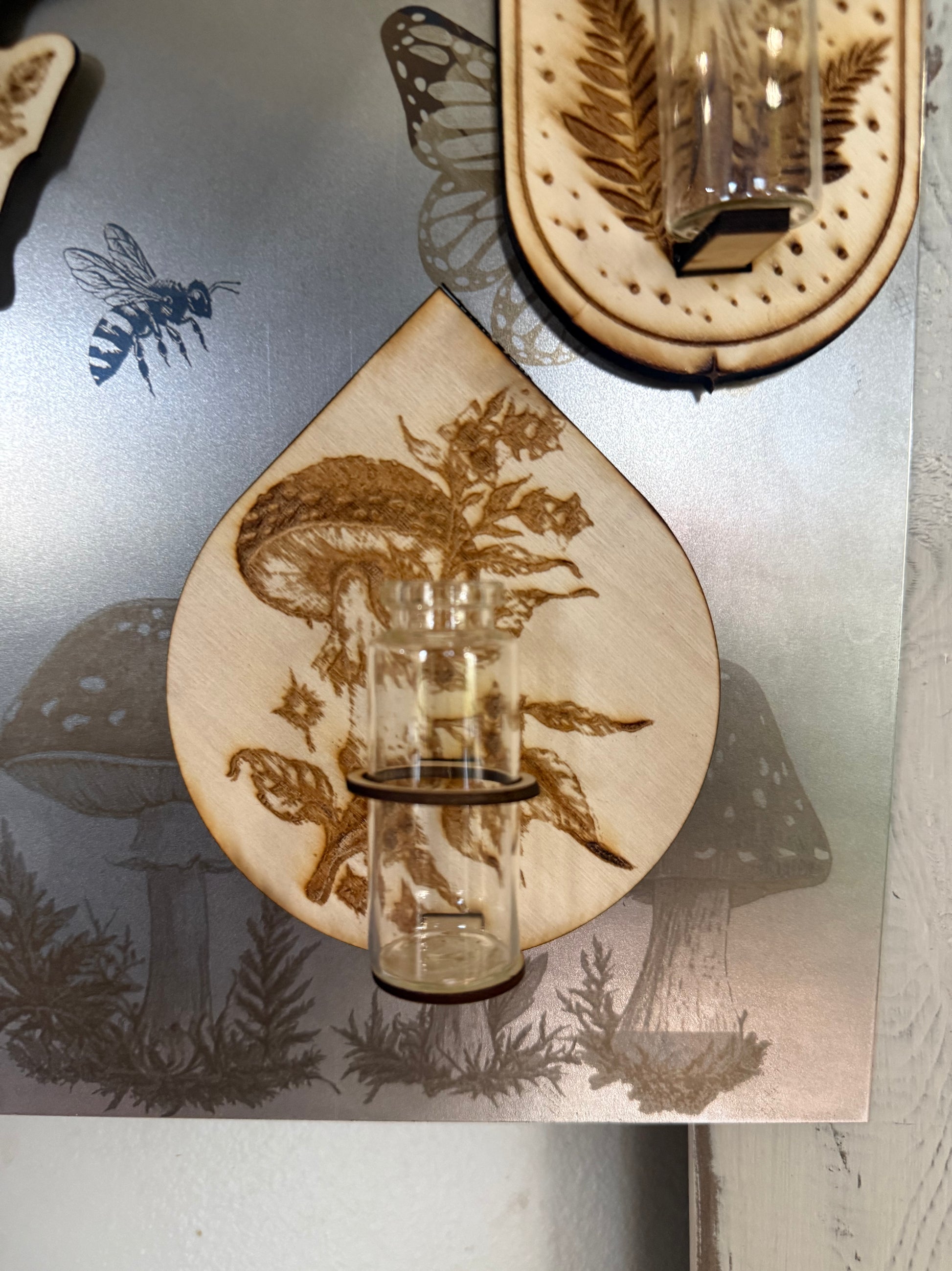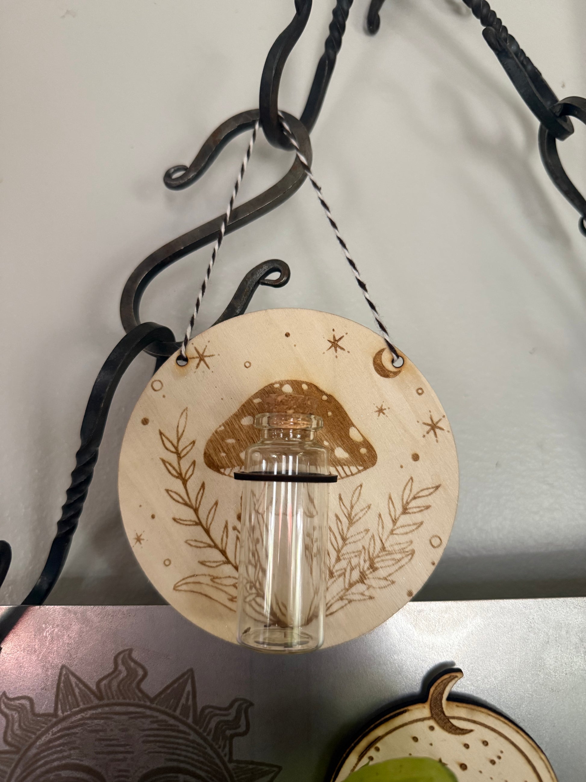Each one is laser-engraved with woodland and celestial imagery, then paired with a delicate glass vial—creating a small but powerful space for growth, intention, and quiet magic.