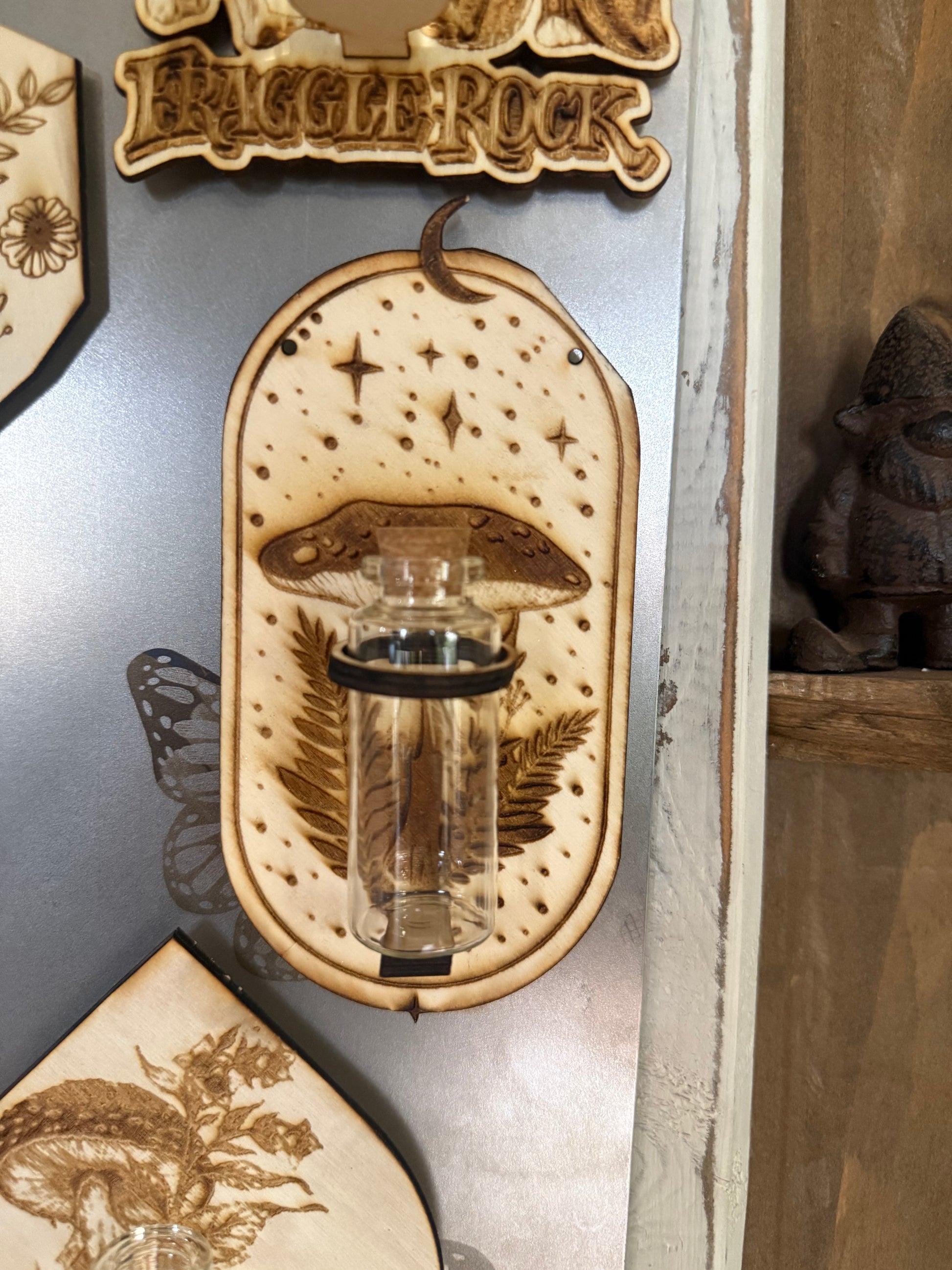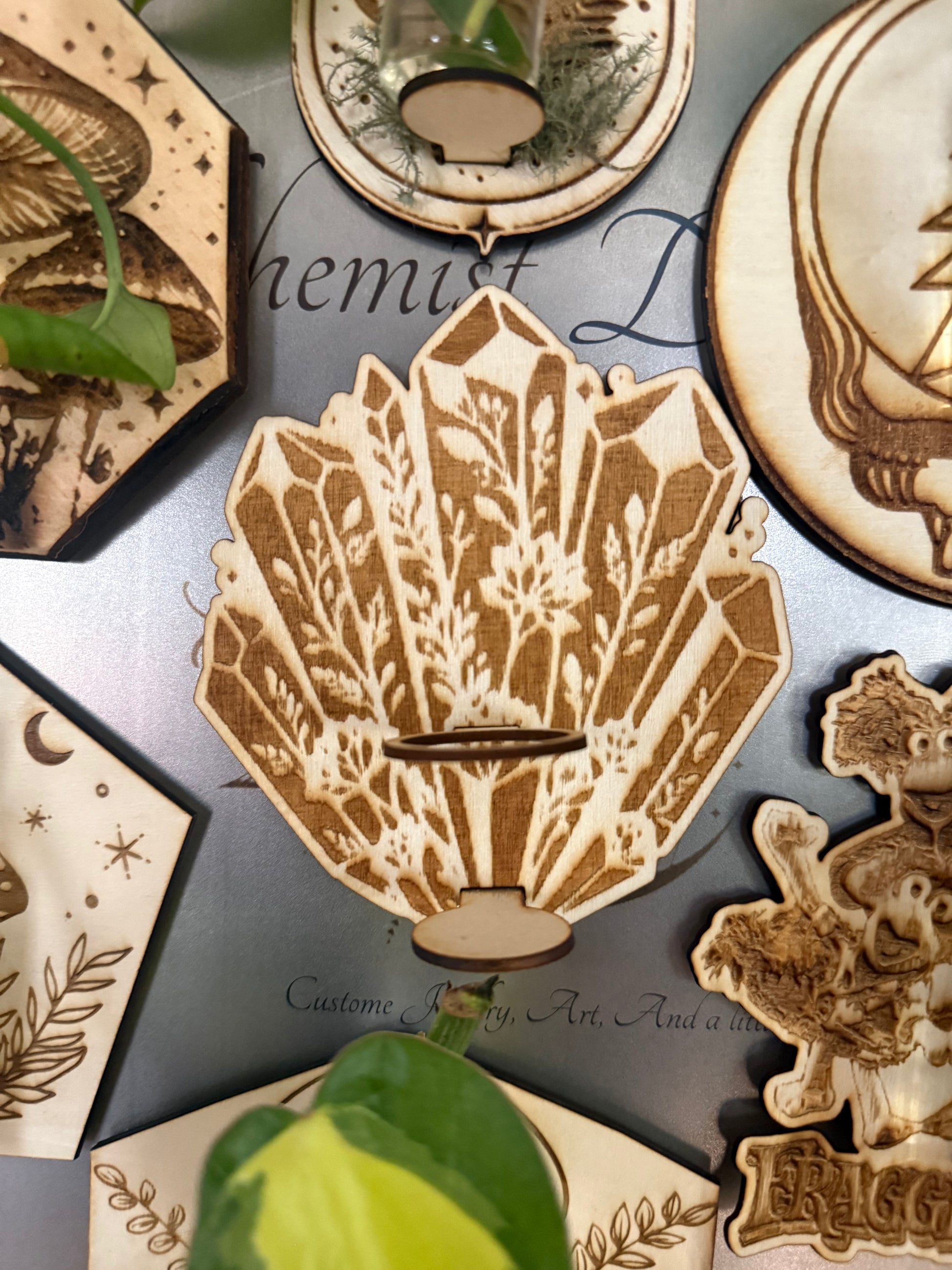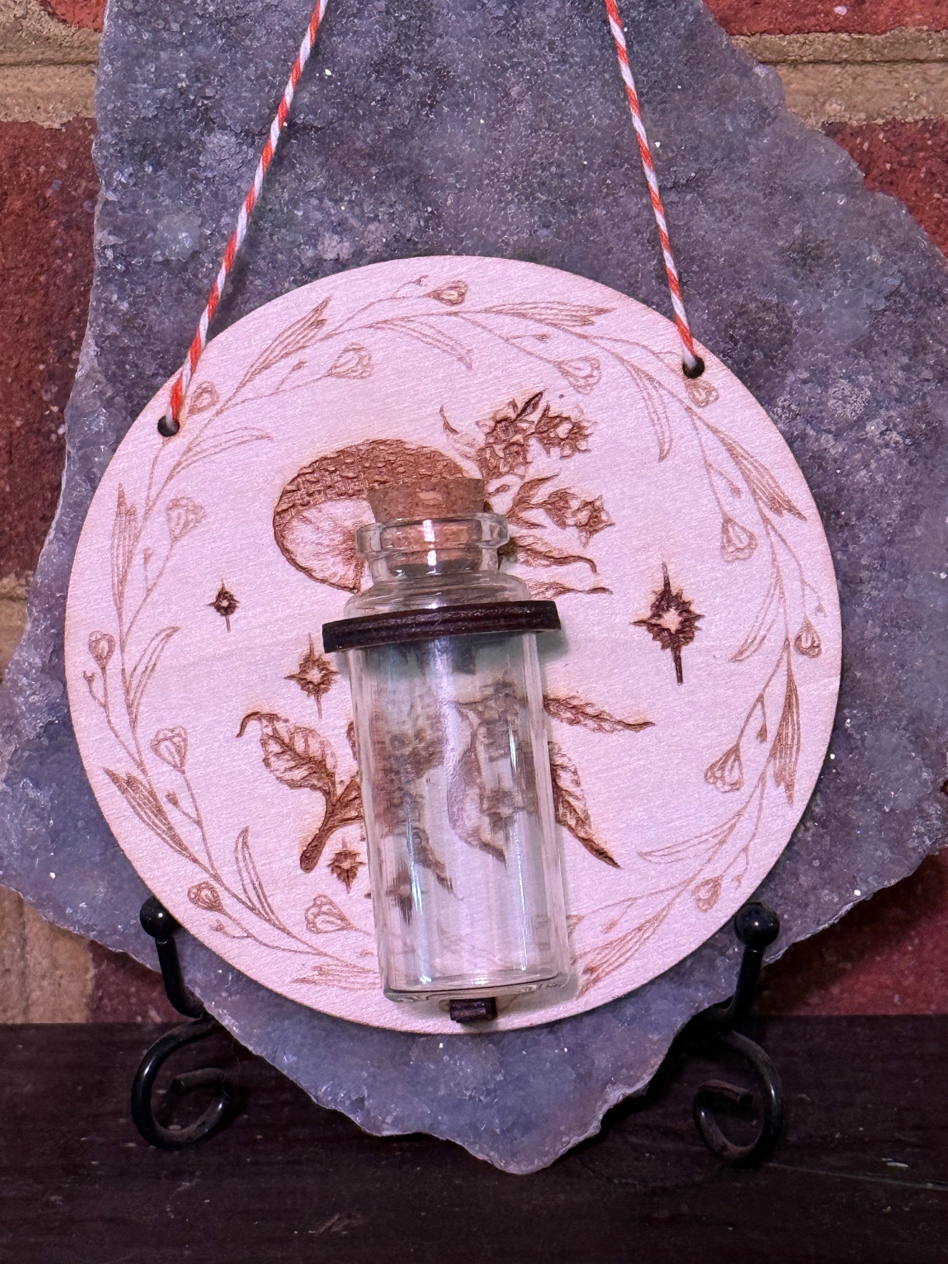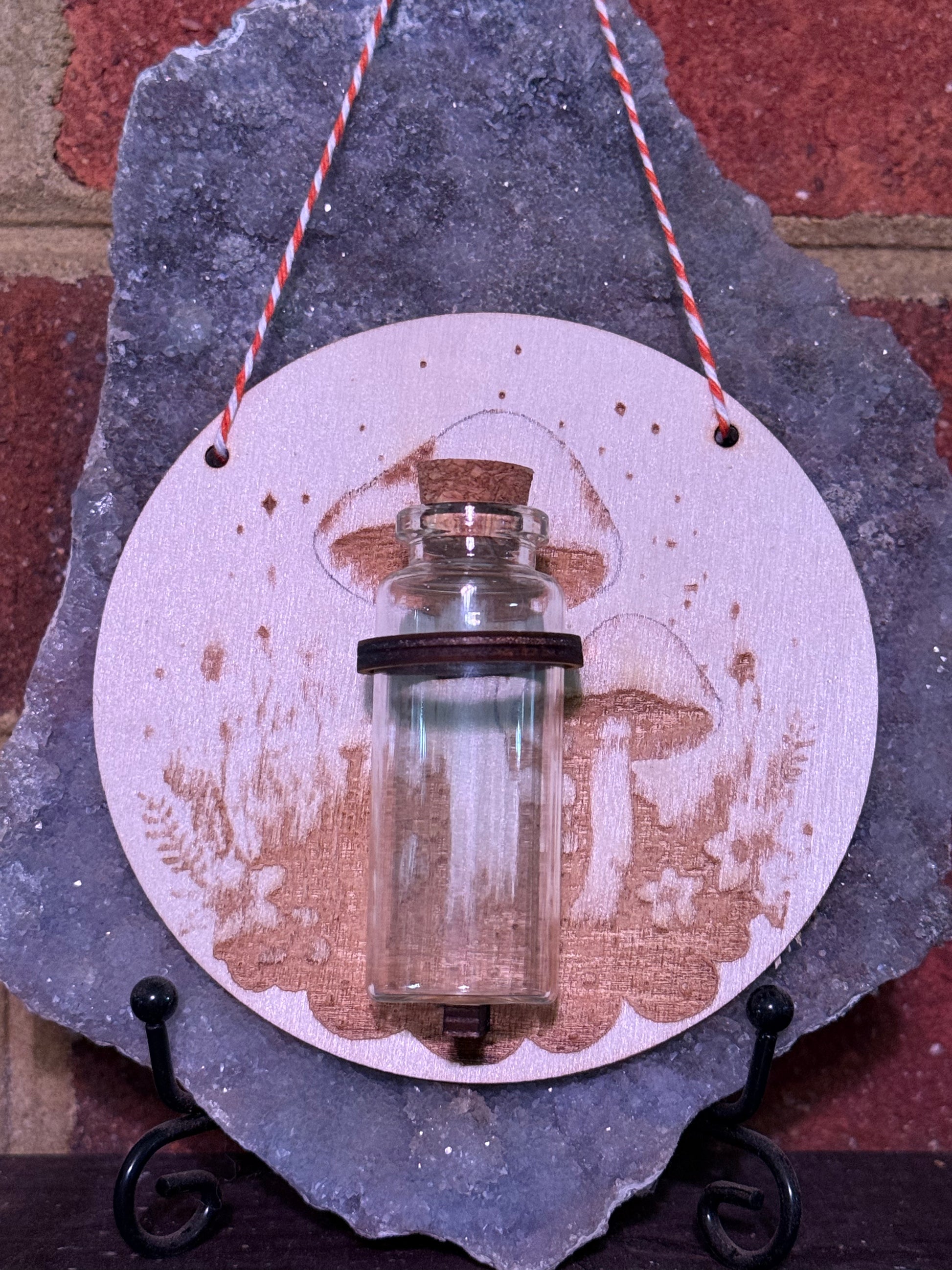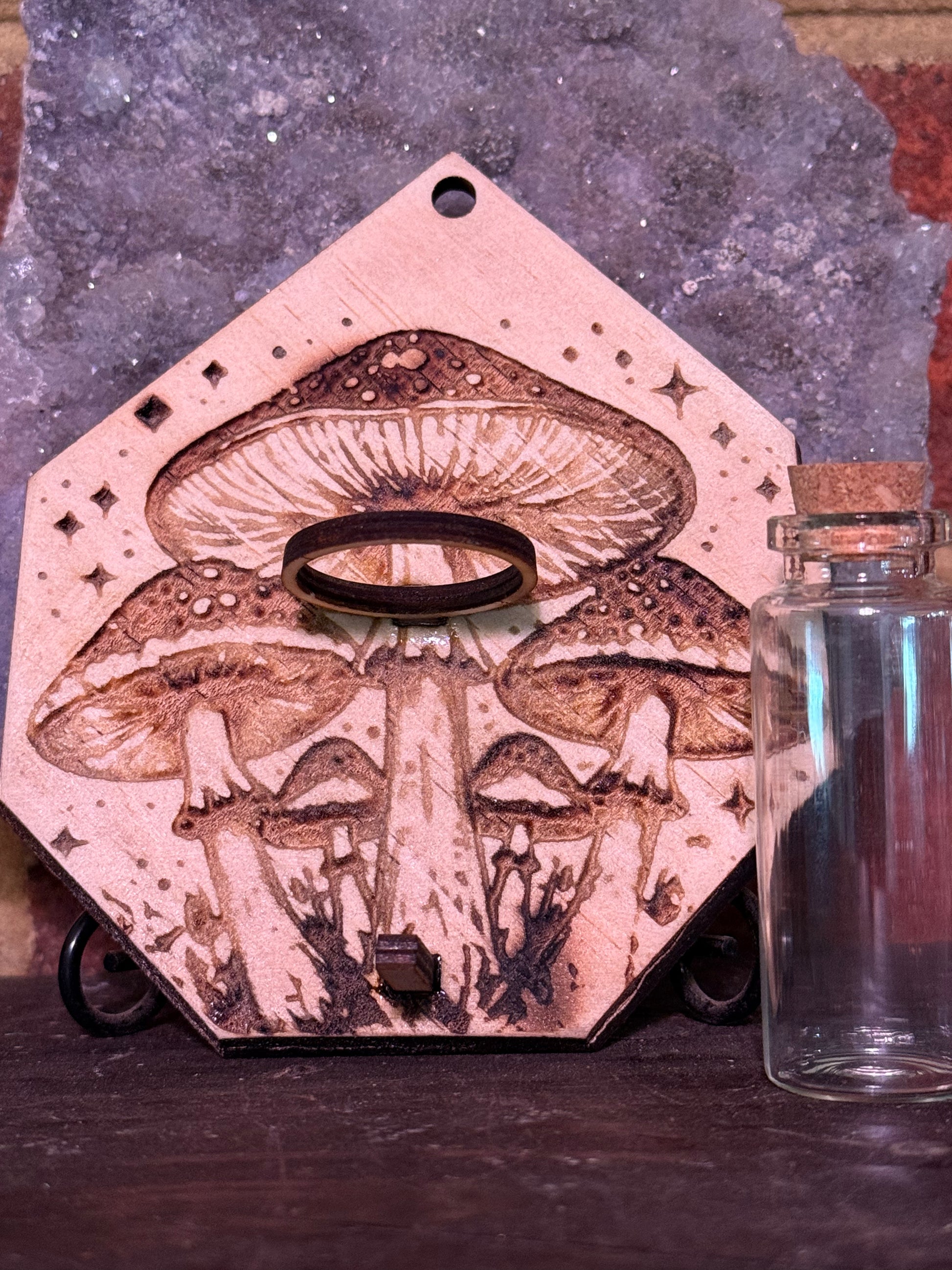 Each one is laser-engraved with woodland and celestial imagery, then paired with a delicate glass vial—creating a small but powerful space for growth, intention, and quiet magic.