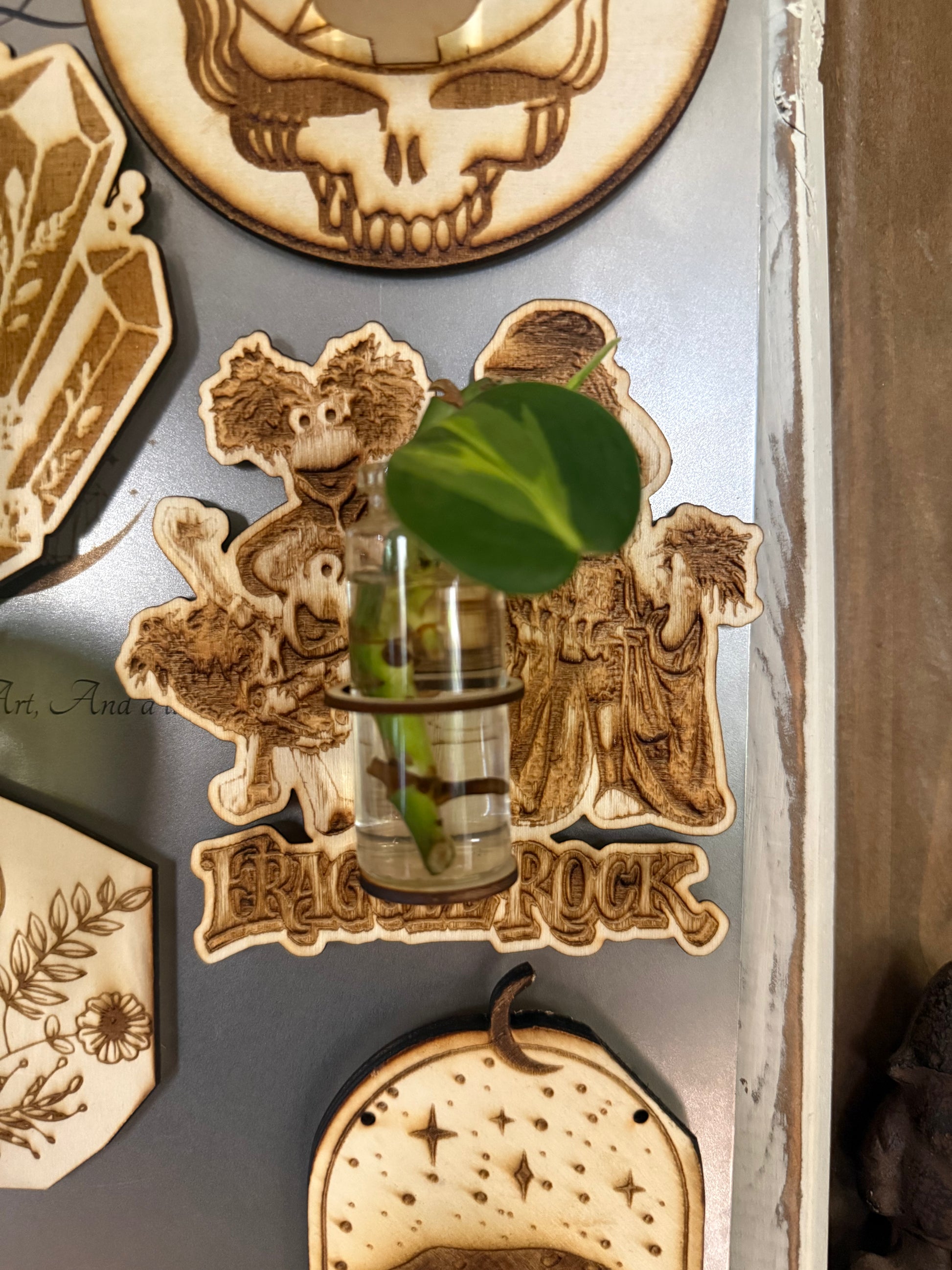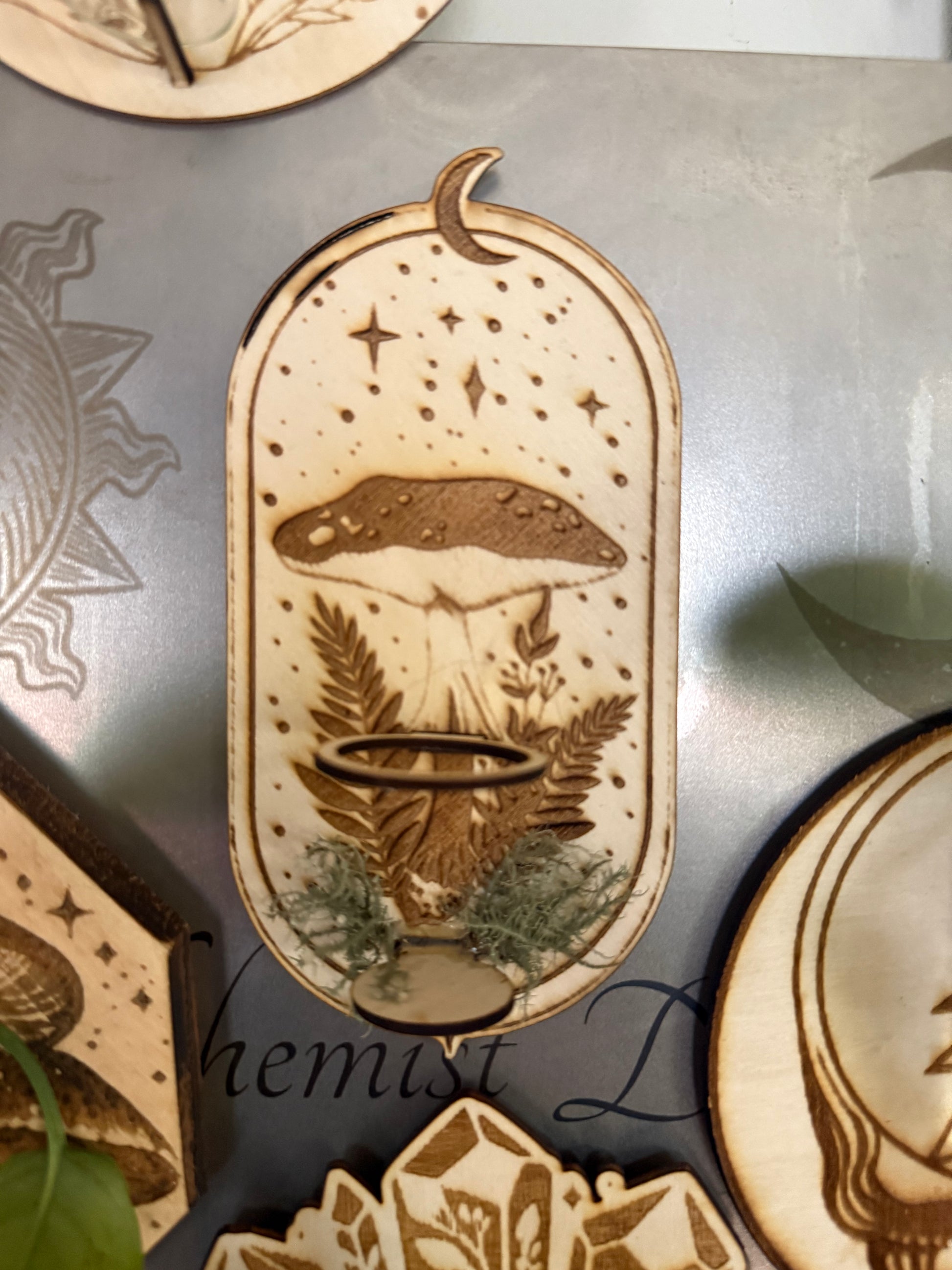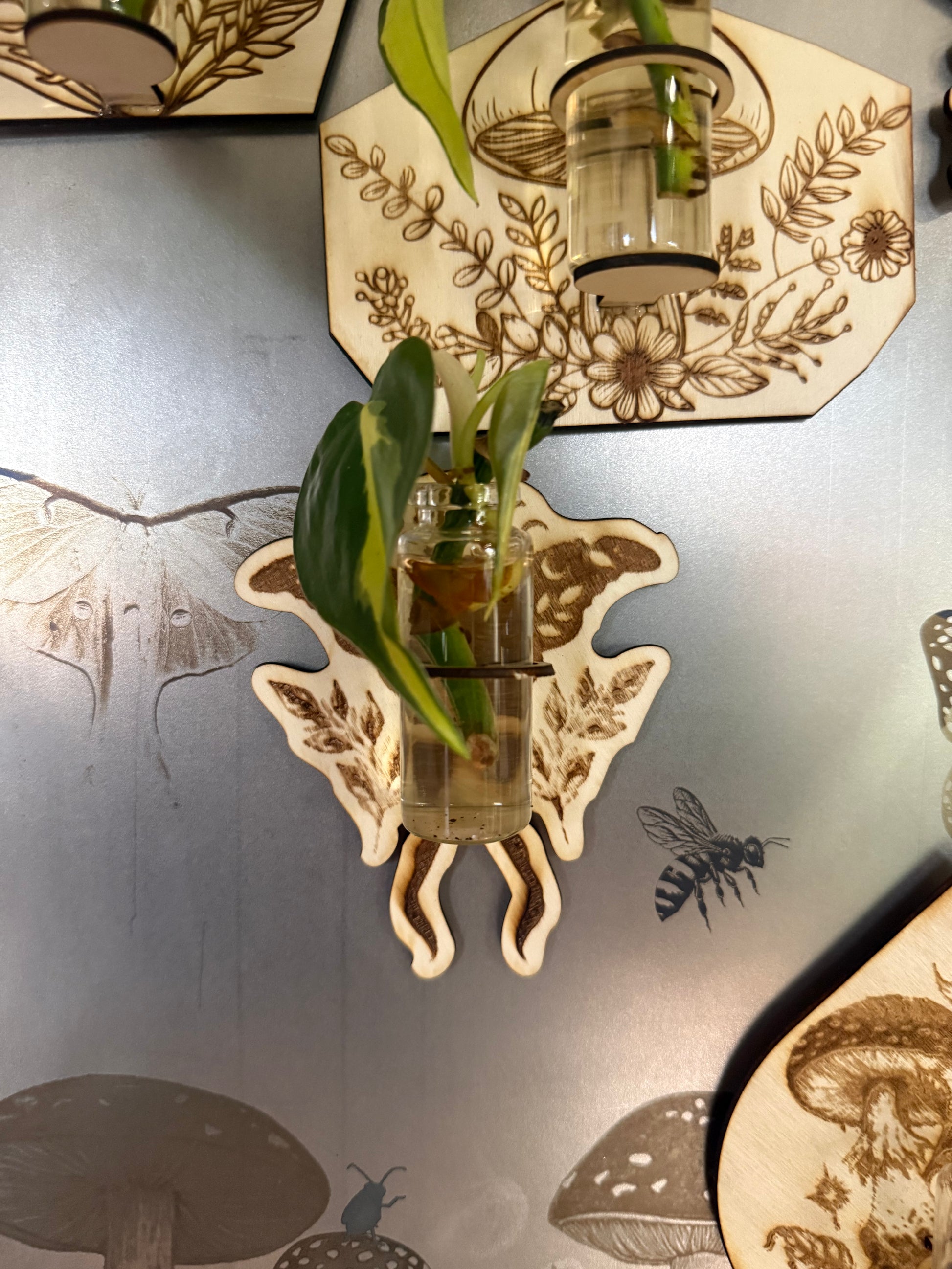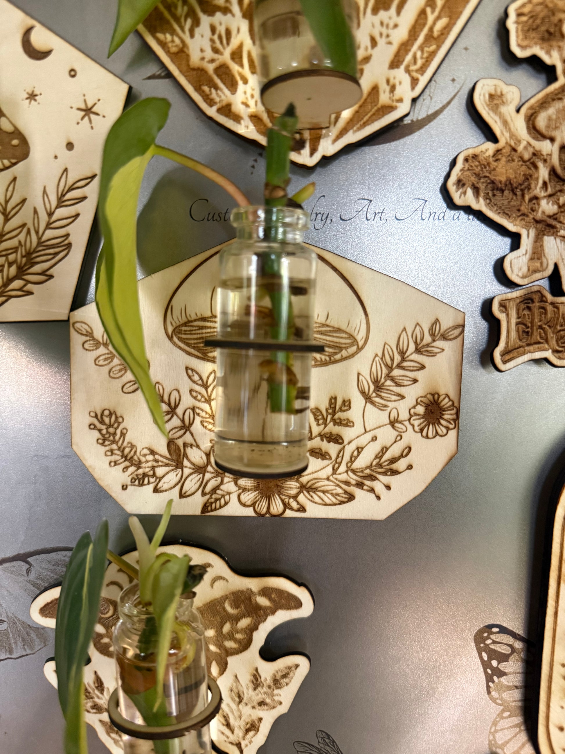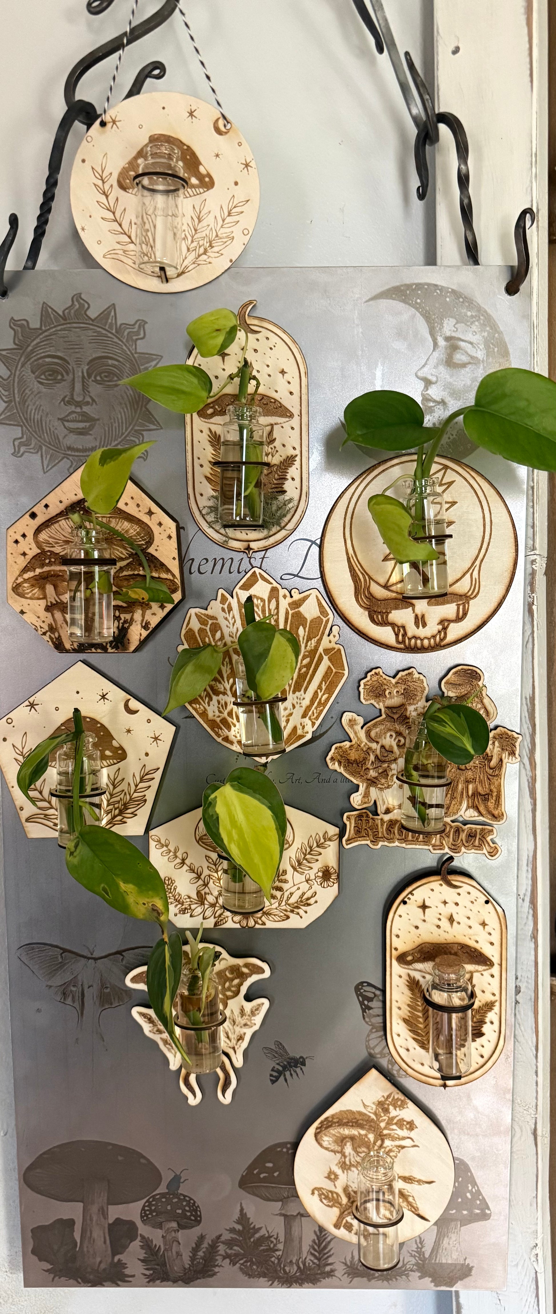 Crafted from engraved wood with thoughtfully chosen designs—mushrooms, botanicals, moons, and forest symbols—each station feels like it belongs in a witch’s cottage, a sunlit studio, or a cozy, plant-filled nook. Perfect for propagating pothos, philodendron, herbs, or any small cutting that enjoys a slow, intentional beginning.