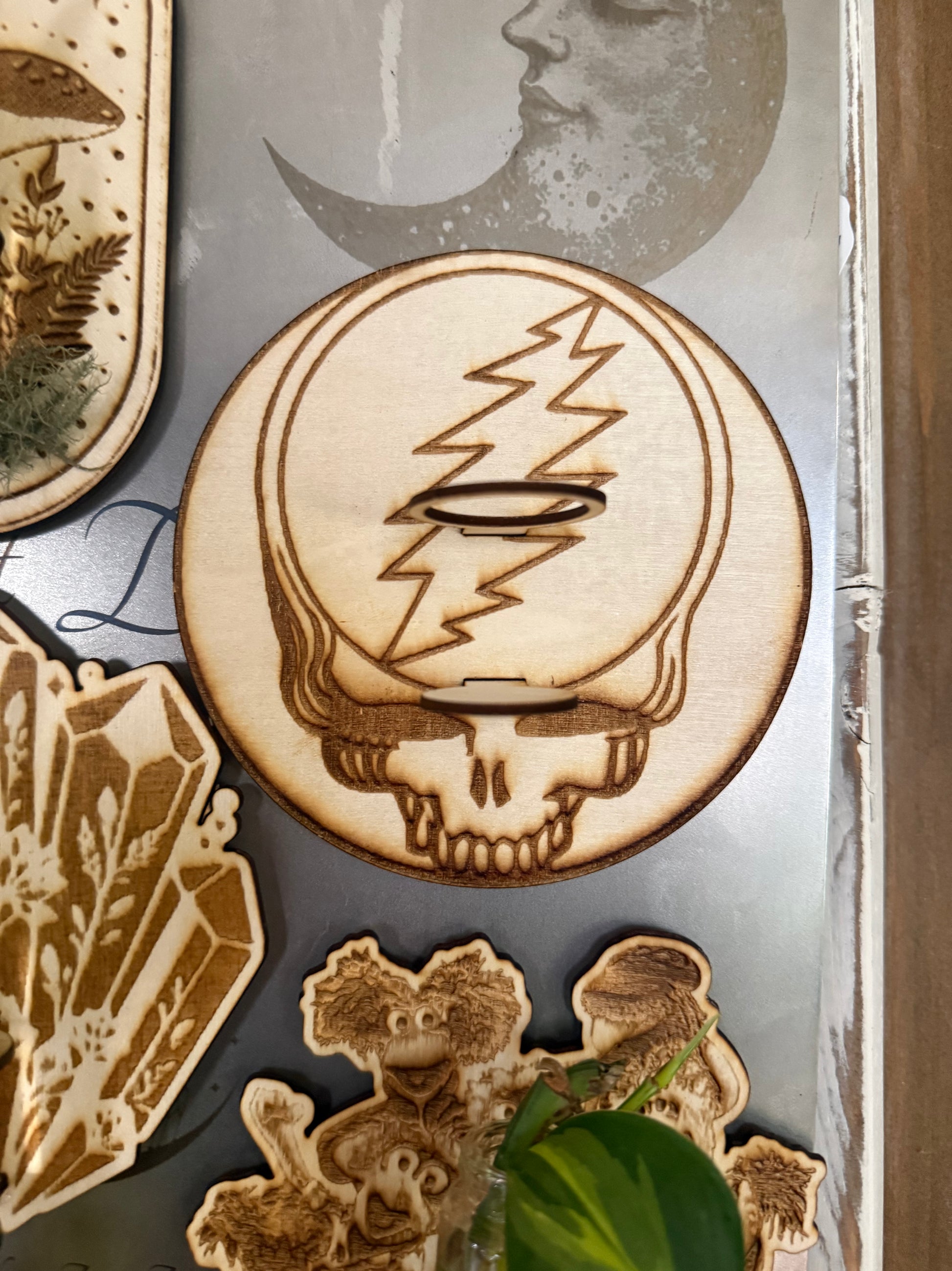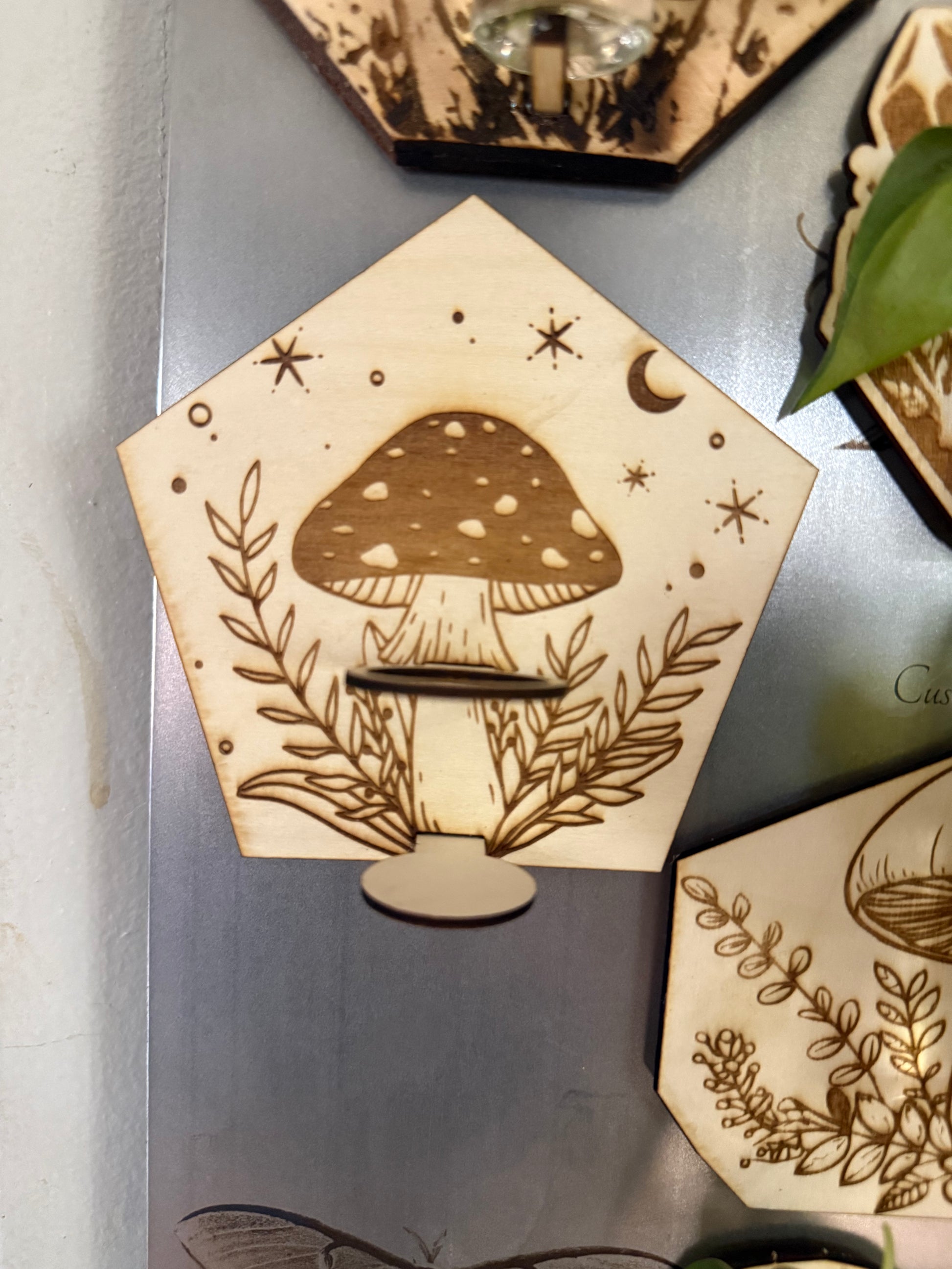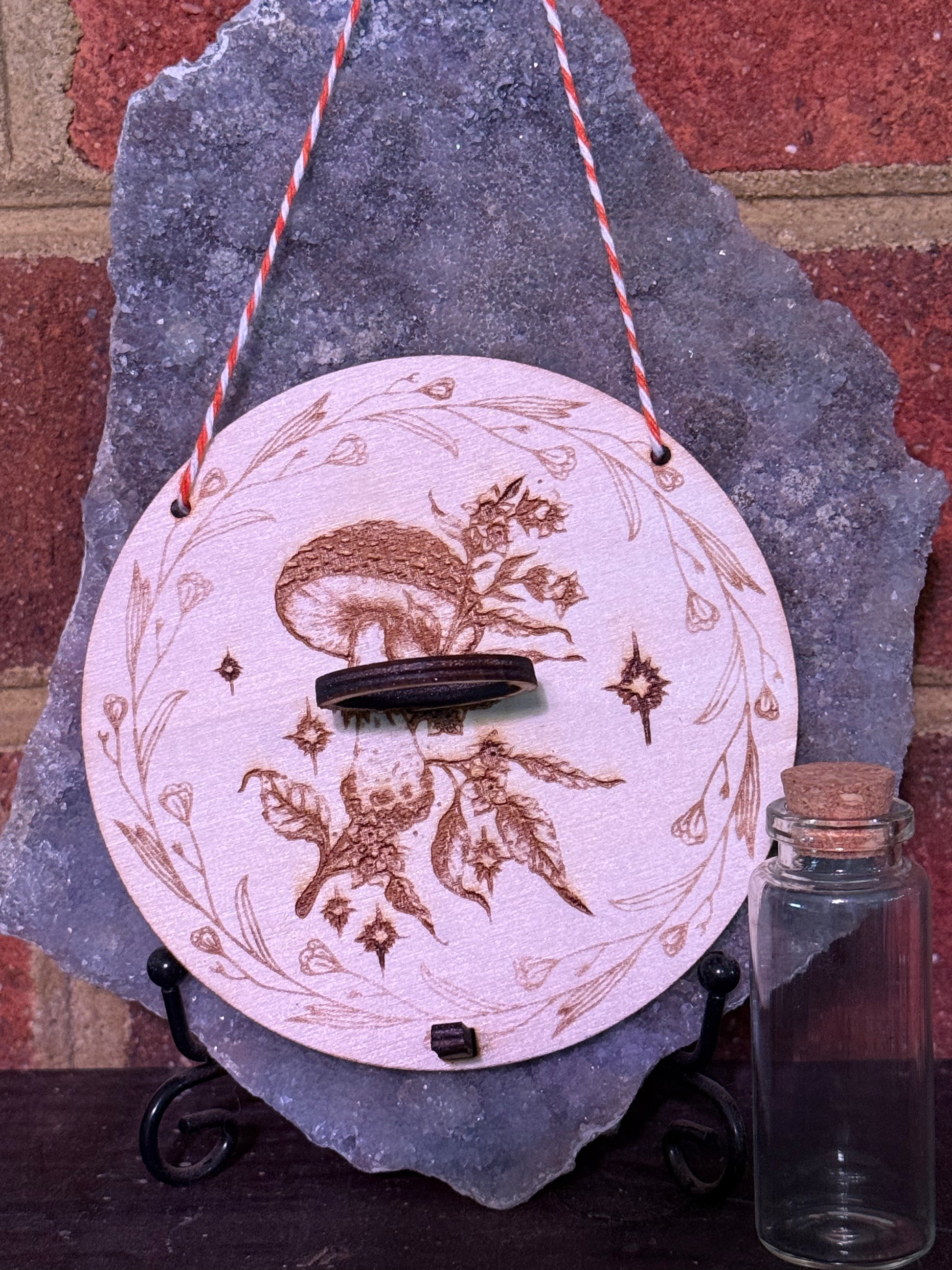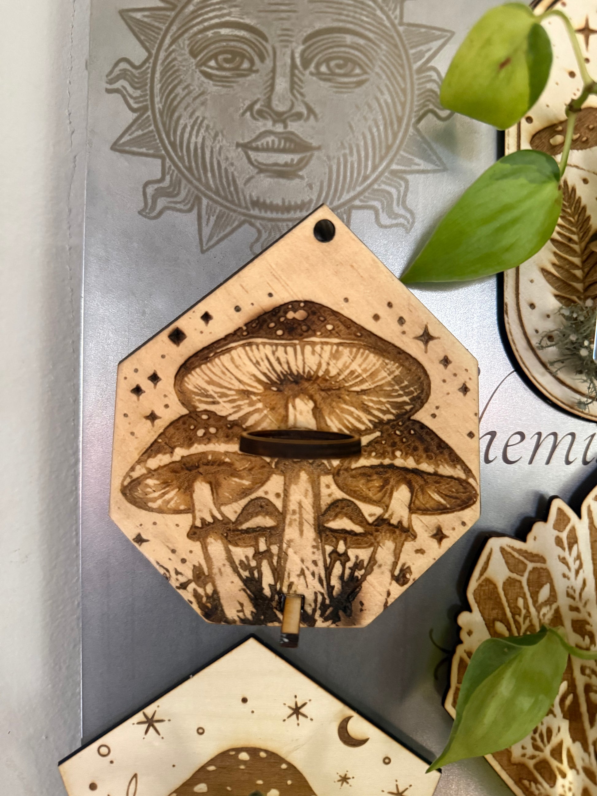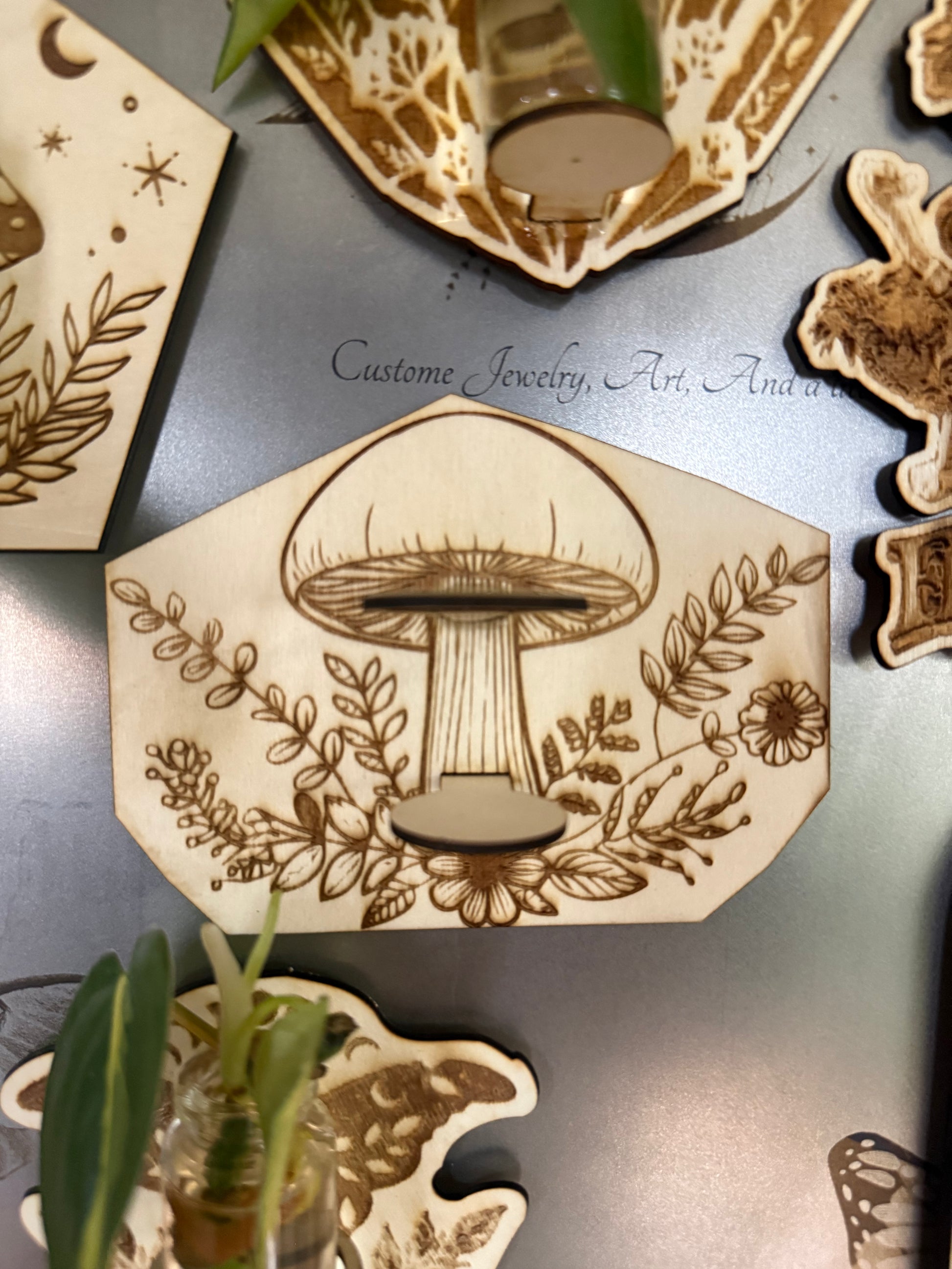 Crafted from engraved wood with thoughtfully chosen designs—mushrooms, botanicals, moons, and forest symbols—each station feels like it belongs in a witch’s cottage, a sunlit studio, or a cozy, plant-filled nook. Perfect for propagating pothos, philodendron, herbs, or any small cutting that enjoys a slow, intentional beginning.