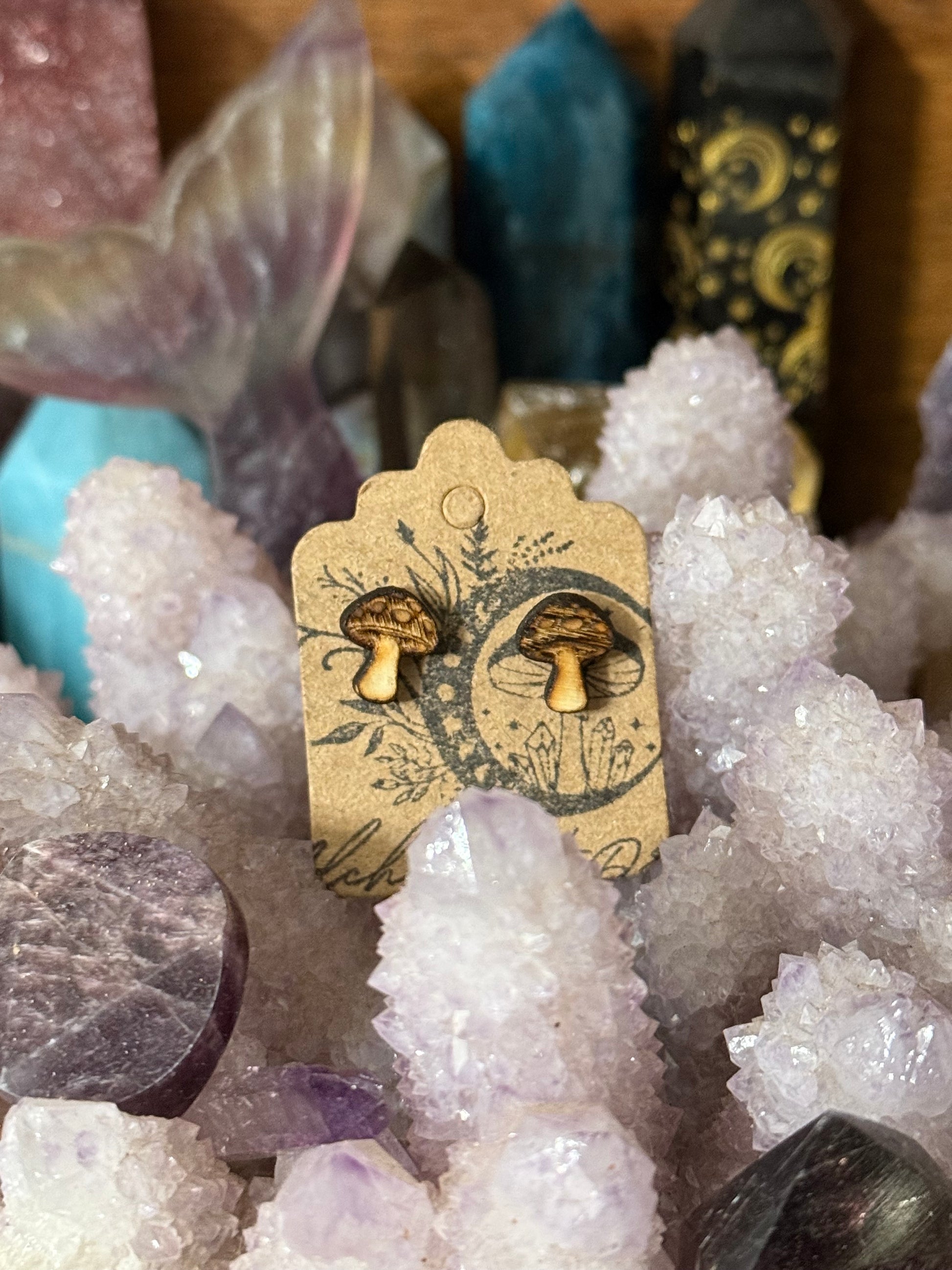 Tiny treasures from the forest floor, these dainty mushroom stud earrings are a love letter to quiet magic and natural wonder. Each pair features a finely engraved wooden mushroom, celebrating growth, resilience, and the unseen magic that thrives beneath the surface.