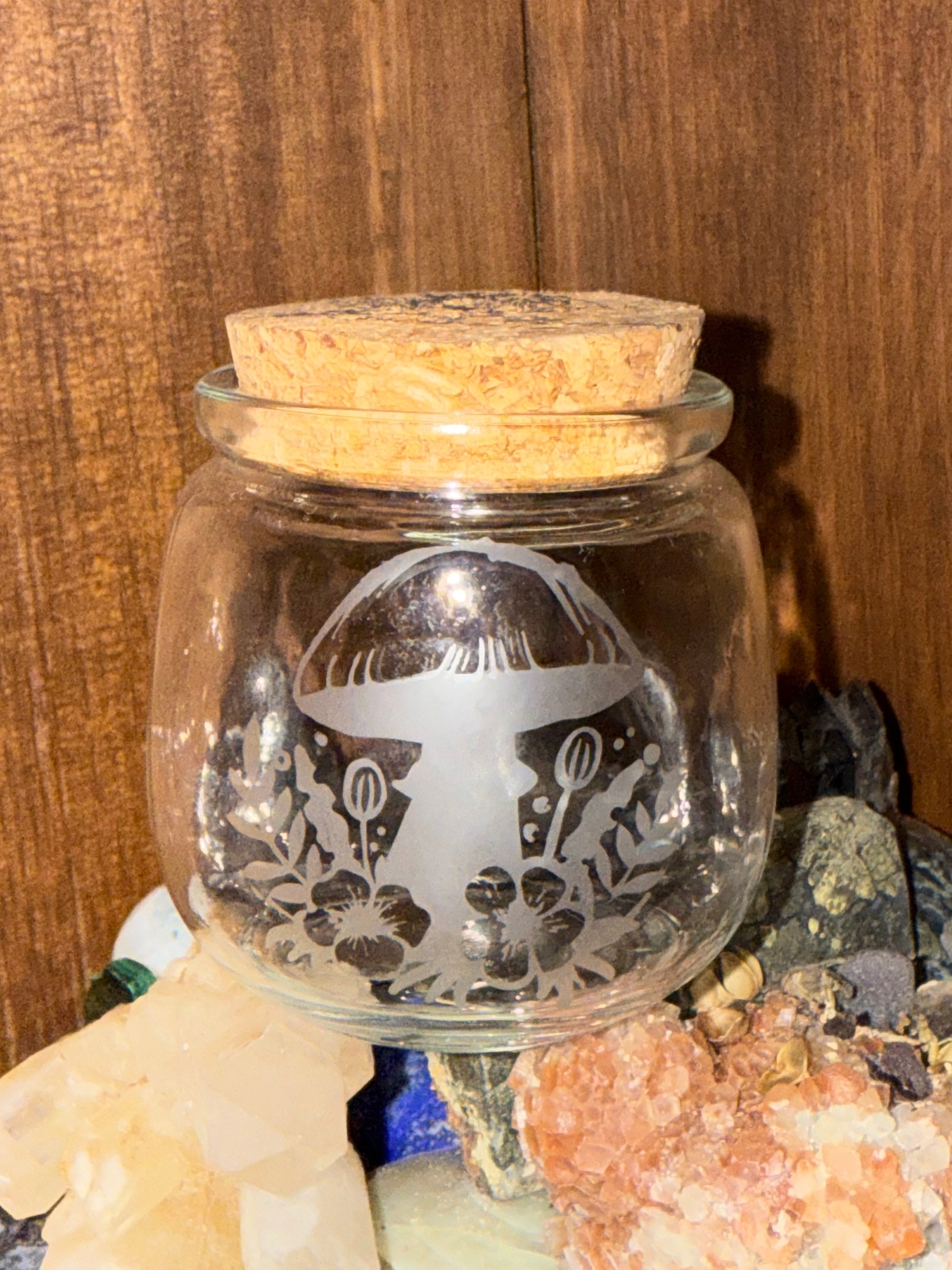 Beautiful glass etched jar great for catching moon water, propagating your clippings, or just a safe little spot for your magical trinkets.