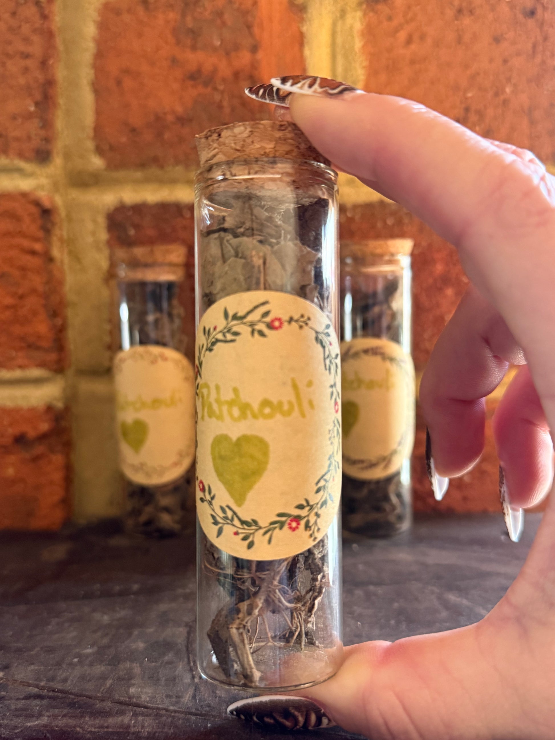 This small apothecary jar is filled with raw patchouli leaves, left unprocessed to preserve their natural texture, aroma, and potency. Earthy, deep, and grounding, patchouli has long been used in ritual work connected to protection, prosperity, anchoring energy, and sensual presence.