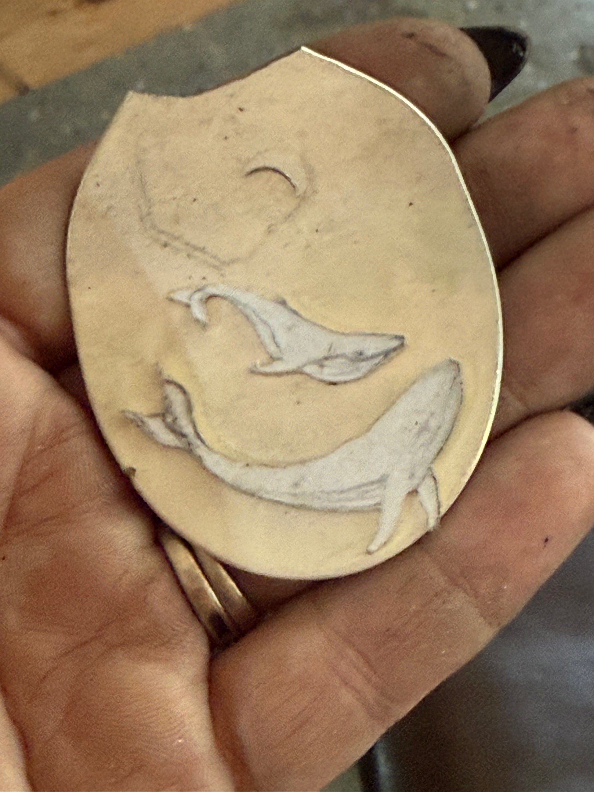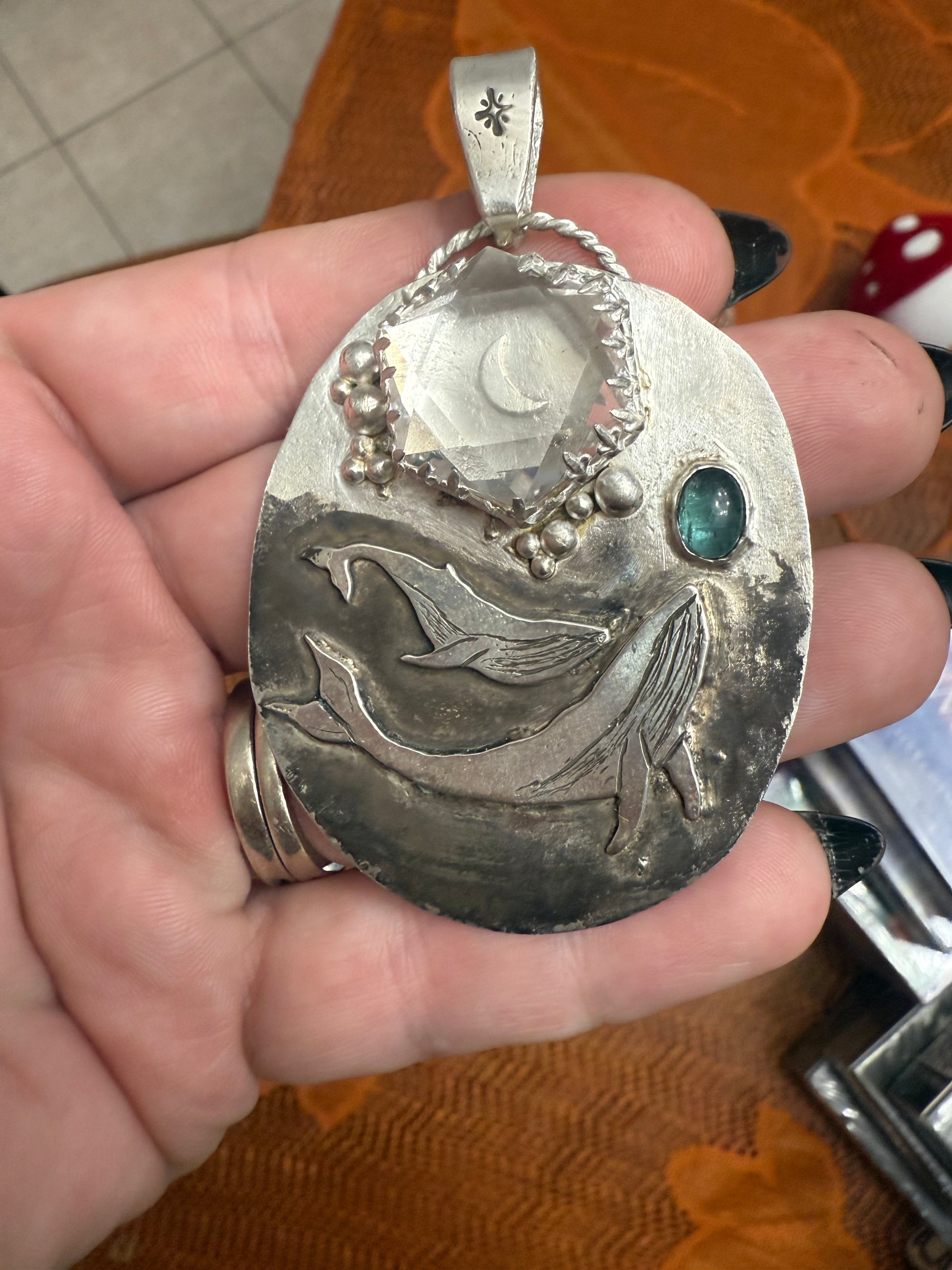 Swimming gracefully across the lower face of the pendant are two etched whales, carved in motion as if dancing beneath celestial waves. These ancient oceanic guardians carry with them the energy of gentle strength, ancestral memory, and the profound stillness of the deep. They are protectors and storytellers—bringing messages from the depths of the soul and the sea.