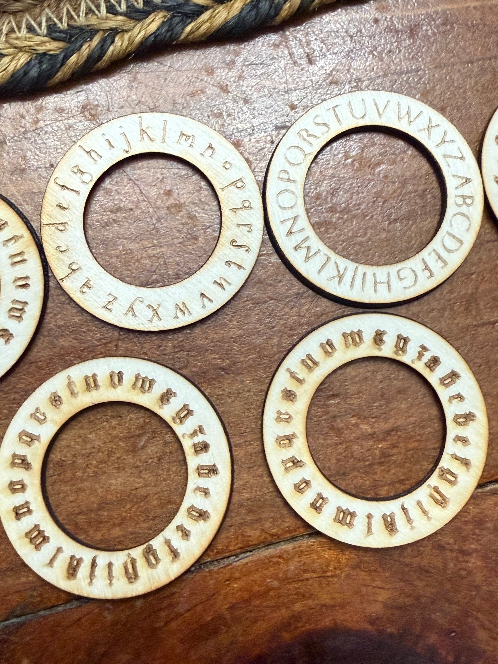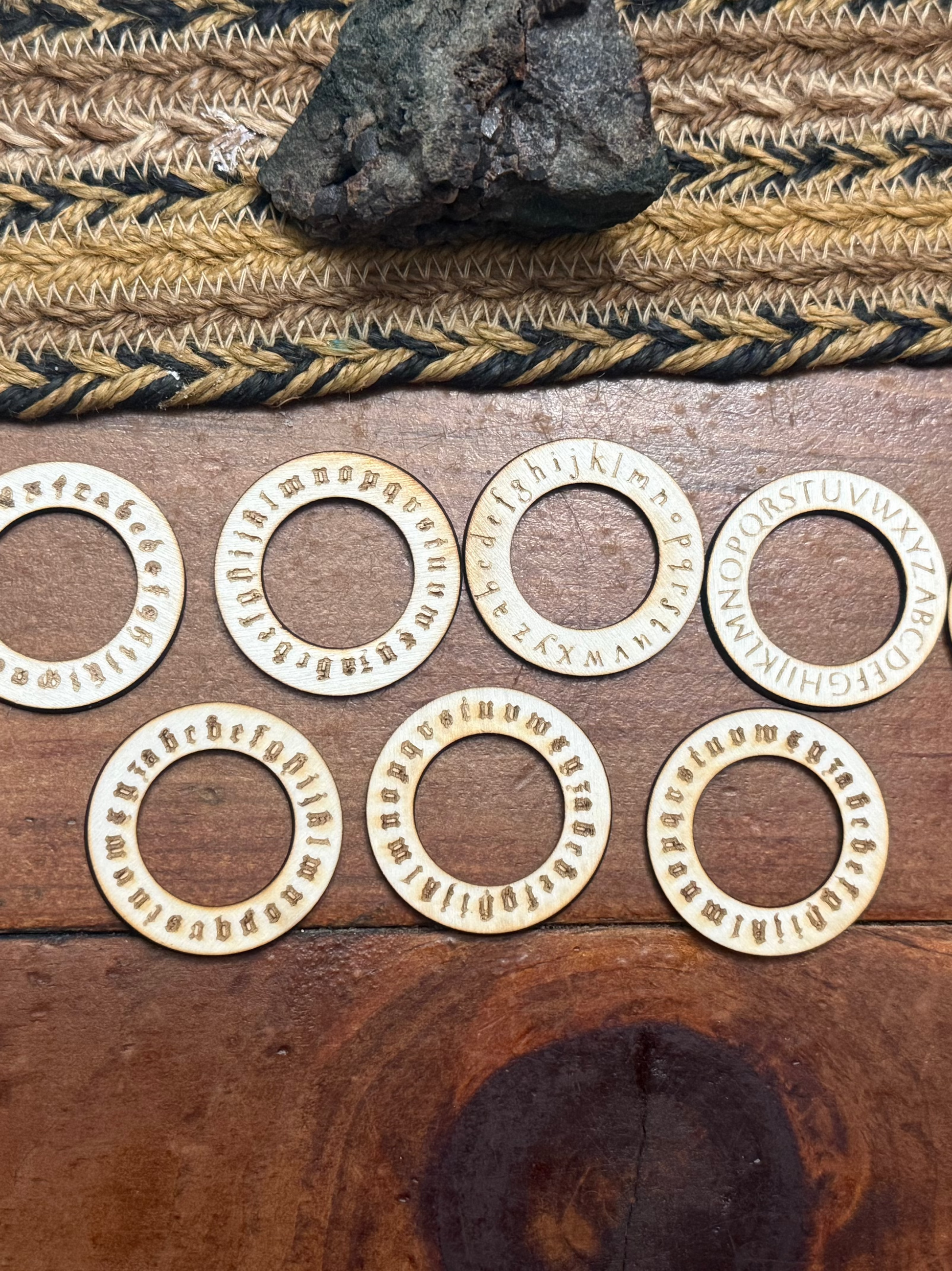 This small sigil tool is engraved on natural wood and designed to support focused intention and symbolic creation. The tool features a circular layout with the alphabet arranged around the edge, forming a simple and intuitive system for sigil work.
