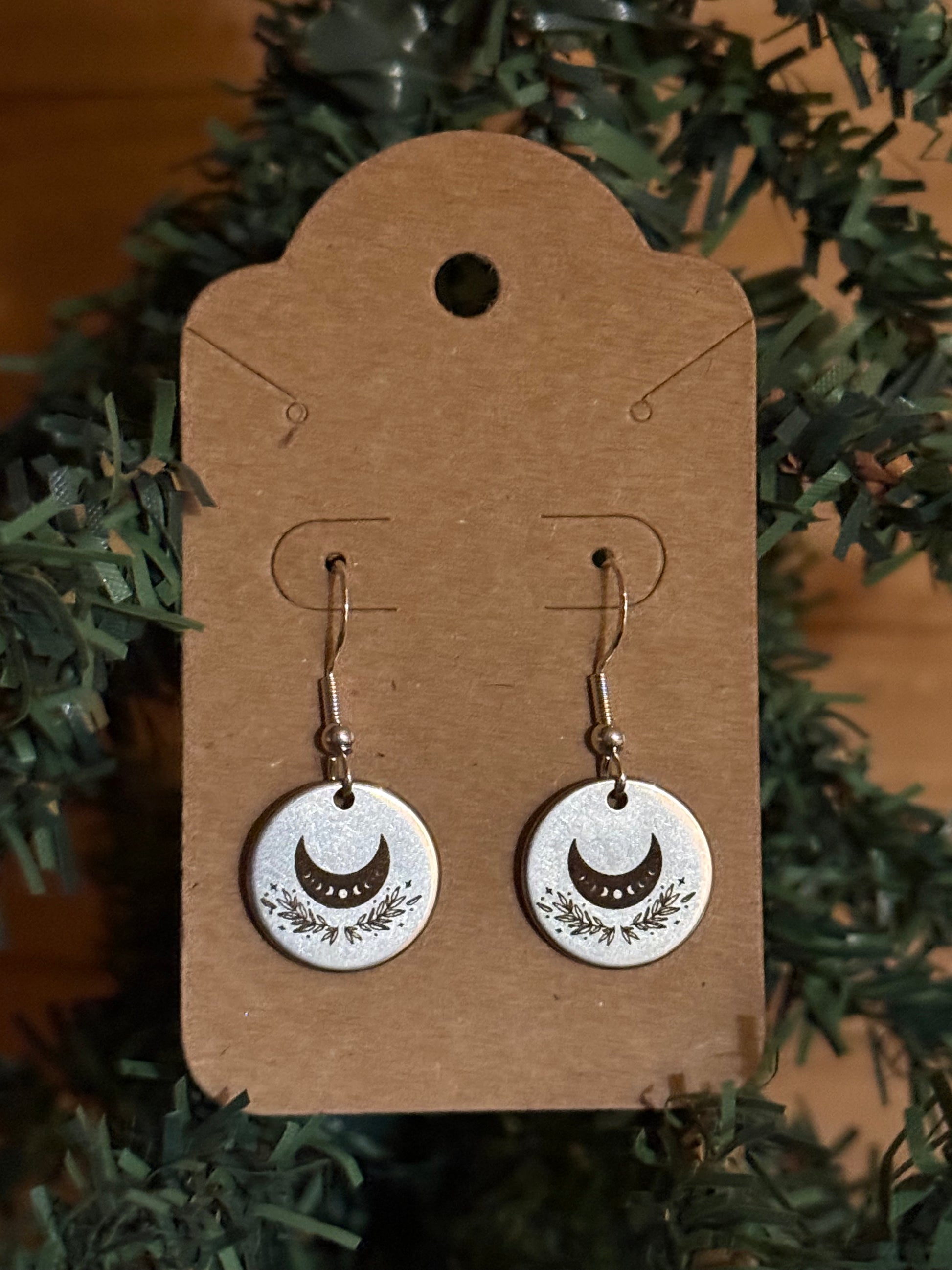 These custom engraved stainless steel dangle earrings are perfect for those with sensitive skin. The sterling silver hooks provide a comfortable fit. Adorned with a magical moon, these earrings serve as a reminder that every phase is beautiful.Custom engraved stainless steel dangle earrings with sterling silver hooks for my sensitive skin girlies out there. Adorned with a magical moon to remind you that every phase is beautiful.